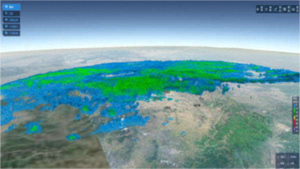 基于地图展示柱状图、降水粒子效果、雷达三维模型、风流场图等